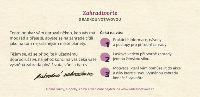 Chcete své drahé polovičce, rodičům nebo dětem přispět na knihu, e-book, webináře nebo kurzy? Hledáte smysluplný dárek nebo potřebujete dárek na poslední chvíli? Nechcete rozhodovat za ně, protože co když touží místo po kurzu po konzultaci? Stáhněte si univerzální poukaz na radost. Do obálky k němu přidejte bankovku a korunu pro štěstí a krásný, hodnotný a nezapomenutelný dárek je na světě. Obdarovaná či obdarovaný si pak u mě mohou objednat, co právě jim přijde vhod. Při pohledu na zahradu si na vás pak s láskou vzpomenou.